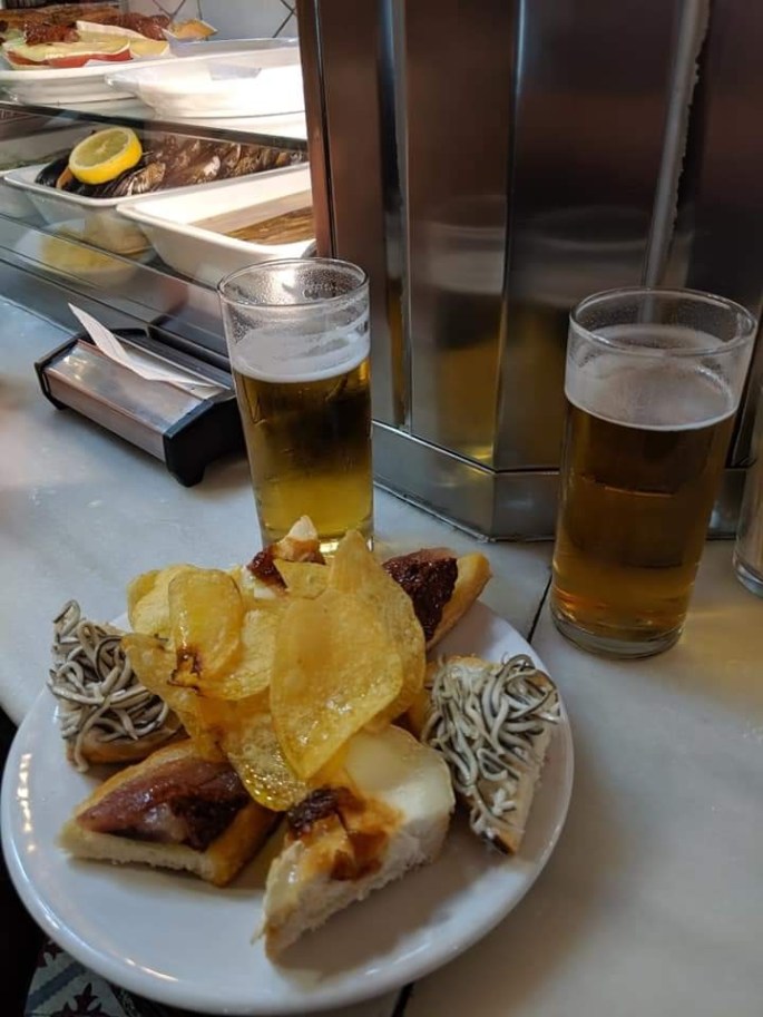 Tapas are quintessential Madrid and the tapas bars in this city are too numerous to count. We begin in an area within walking distance of the famous public square, Puerta del Sol. Like many cities, there are those places that cater to the visitor, and then there are those that are favored by the local. It is in these local bars that we were fortunate to find ourselves sharing plates of olives, jamon serrano, anchovies, gulas, shrimp, morcilla, and tortilla de patatas. Of course, we washed all of this wonderful food down with glasses of local beers.
